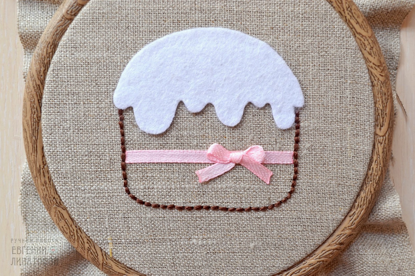 8. Подготавливаем коричневые мулине для вышивки. У меня она в 6 нитей толщиной. Вышиваем контур кулича. Длина стежка 2мм. По завершении вышивки завязываем на изнаночной стороне узелок.